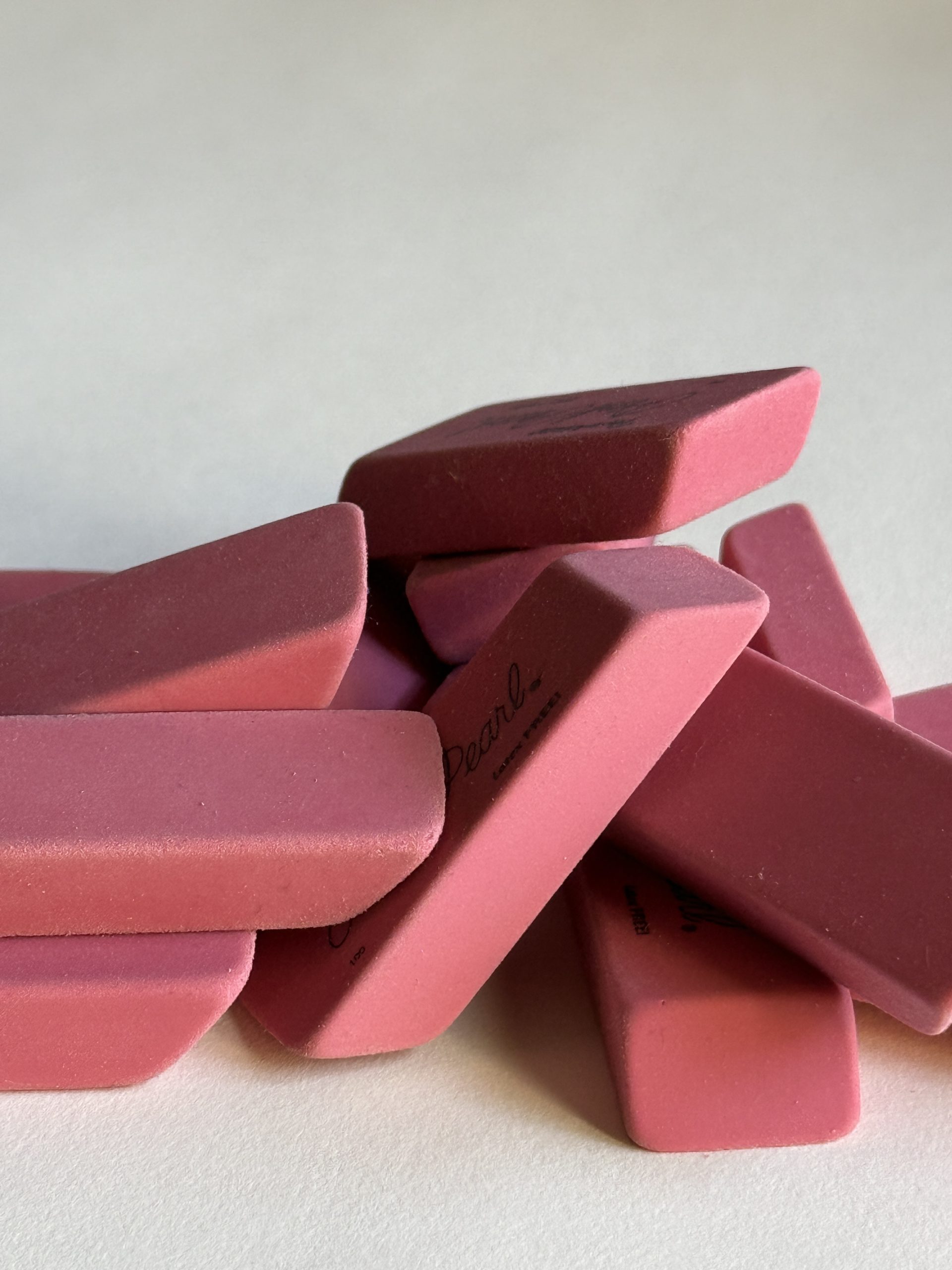 I have absolutely zero unhappy memories with erasers, quite the contrary! The color, smell, shape, feel of the pink eraser sparks all kinds of happy memories. Most important, I was not afraid to make mistakes as I learned to become a writer. The little pink eraser was by my side to help me alter mistakes. Mistakes in spelling. Mistakes in punctuation, capitalization. And more crucial mistakes too—mistakes in content.